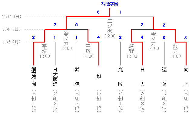 | 10月12日(日) | 桐光学園 | 9:30 | A | 日大 | 2 | 0-1 | 1 | 桐光学園 |
