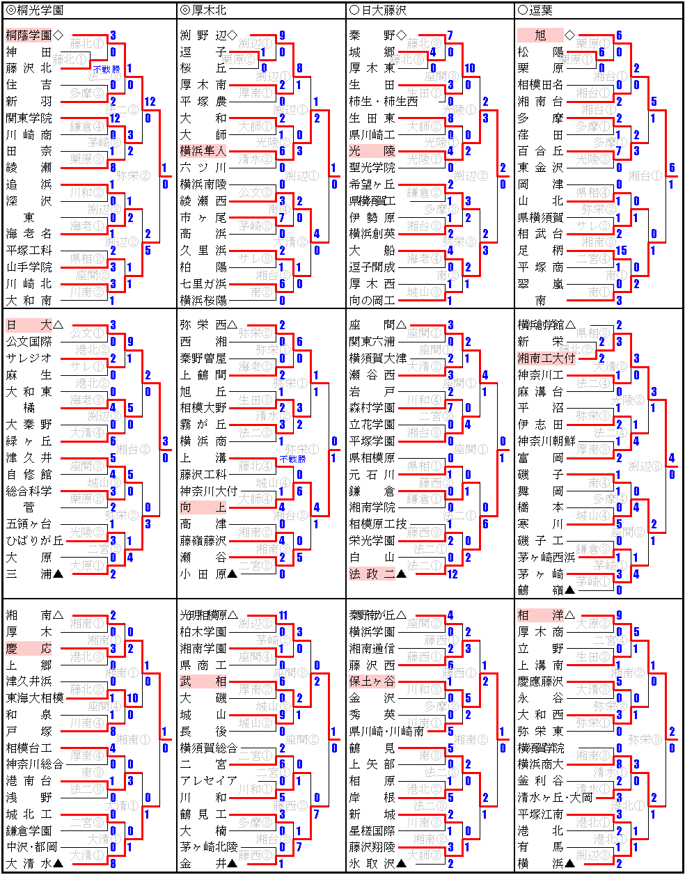| 2 | 日大藤沢 | 2△2 | -------- | 2△2 | 2○1 | 1 | 0 | 2 | 5 | +1 |