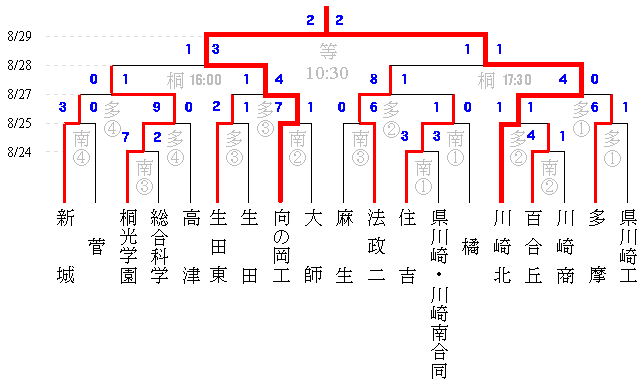 | 8/24(金) | 1回戦 | 川崎南高 | 9:30 | 住吉 | 3 | - | 3 | 県川崎 川崎南合同 |
