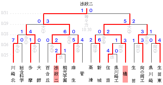 | 8/29(日) | 準決勝 | 大師 | 9:30 | 法政二 | 3 | 2-0 | 0 | 多摩 |