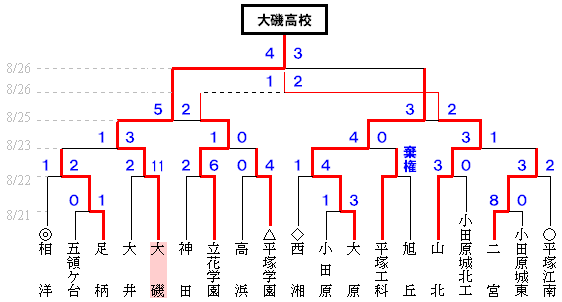 | 8月22(火) | 2回戦 | 平塚学園 | 9:30 | 平塚学園 | 4 | - | 0 | 高浜 |