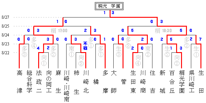 | 8/24(土) | 準々決勝 | 多摩 | 9:30 | 多摩 | 3 | 1-1 | 2 | 川崎北 |