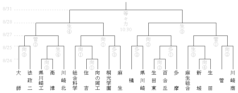 | 8月25日(金) | 2回戦 | 多摩 | 9:30 | 多摩 | 7 | 4-0 | 0 | 生田東 |