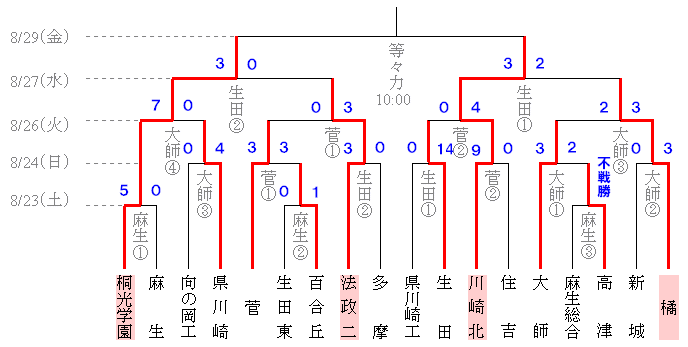 | 8月27日(水) | 準決勝 | 生田高校 | 9:30 | 川崎北 | 3 | 1-0 | 0 | 橘 |