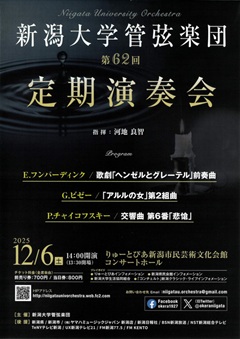 今日は新潟大学管弦楽団の定期演奏会を聴かせていただくことにしました。新潟大学は私の母校であり、はるか昔の入学式で聴いた式典演奏の「マイスタージンガー前奏曲」がこのオケとの出会いであり、夏のサマーコンサートと12月の定期演奏会は、毎回楽しみにしています。