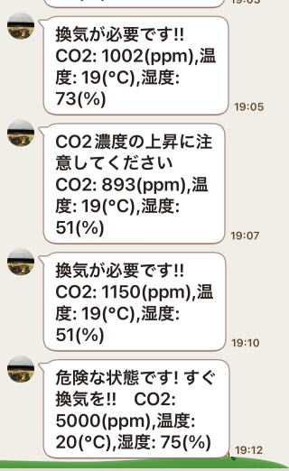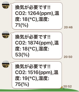 右 : CO2濃度が1500ppmを超えたとき、1000ppmを超えたとき、700ppmを超えたときの3段階で通知